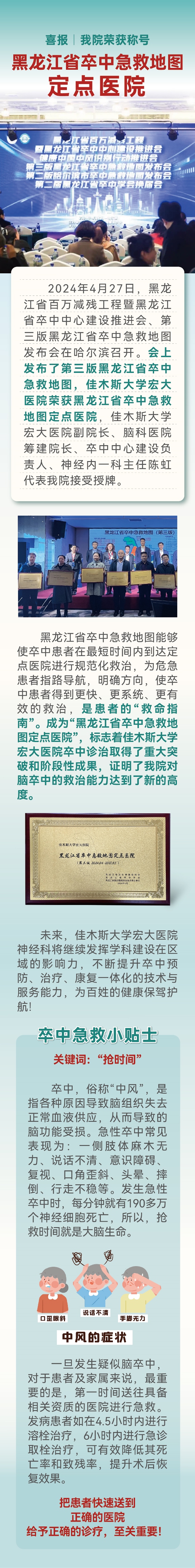 您现在的位置:首页 >医院动态 >医院要闻 医院动态 Hospital dynamic 通知公告 医院要闻 媒体报道 门诊指南 Outpatient 医保须知 medical insurance 住院流程 problem 喜报 | 我院荣获黑龙江省卒中急救地图【定点医院】称号——佳木斯大学宏大医院 发布时间 :2024-05-04 【点击↓下方图片查看名医专家介绍】